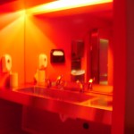 The coolest thing we found was a toilet room at the end of a corridor with a red glow…. Our curiosity drew us in where we found that the stainless steel counter tops and partitions were reflecting the paint color from the floor, walls and ceiling… Three standard can-light fixtures lighted the room that had been painted completely with bright, true red paint. We wonder if the designer planned it that way or just got lucky.. Either way, we learned of a cool new look to try. I like that the look was achieved with PAINT. No expensive tile, stone or other finish that is often prevented by a modest budget. It would be a cool look for a nightclub, sports arena, or other area that needs to be easily cleaned and very durable. The look offered practical durability with a low cost. I wonder if other colors, like orange, blue, green or pink work as well…. I also wonder if the look was achieved through the positioning of the lights. I accidently took a flash picture and the flash turned the look into a red room with stainless steel accents. In other words it eliminated the “glow”. I do know that it had much to do with the quantity of vertical stainless steel in the room because the Men’s room had less full height partitions, so the “glow” was less dramatic, Yes , I think too much, but that is a good thing when I am thinking for the benefit of your project!! That is what we Architects do. It all starts while exploring architecture near & far.